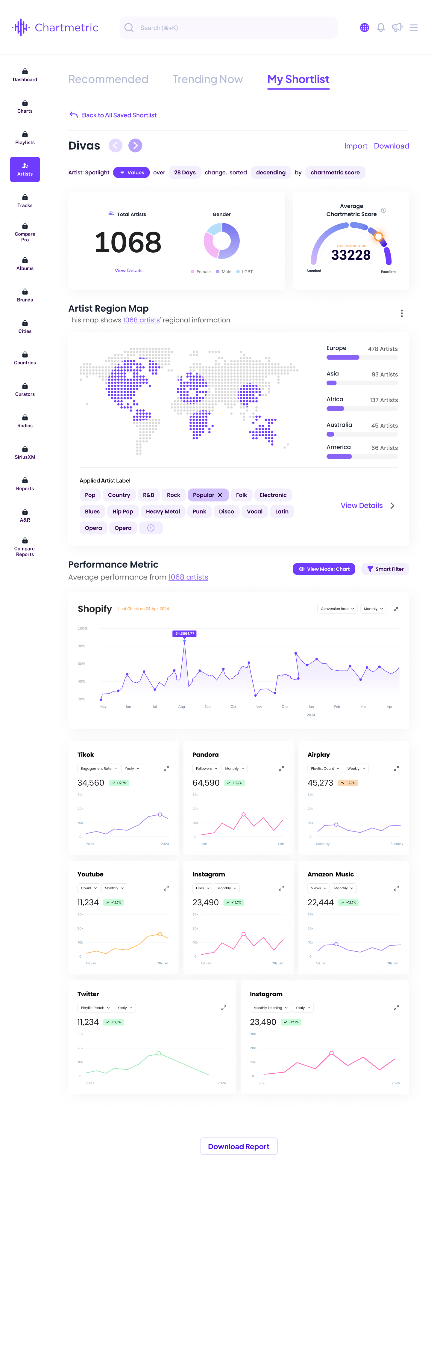 After the interface redesign, my experience improved drastically. The clean, dashboard layout allowed me to easily navigate through key artist and platform metrics. With the help of clear charts, graphs, and maps, I could quickly understand performance trends, saving me time and helping me make informed marketing decisions. The engaging, streamlined design made using Chartmetric much more efficient.