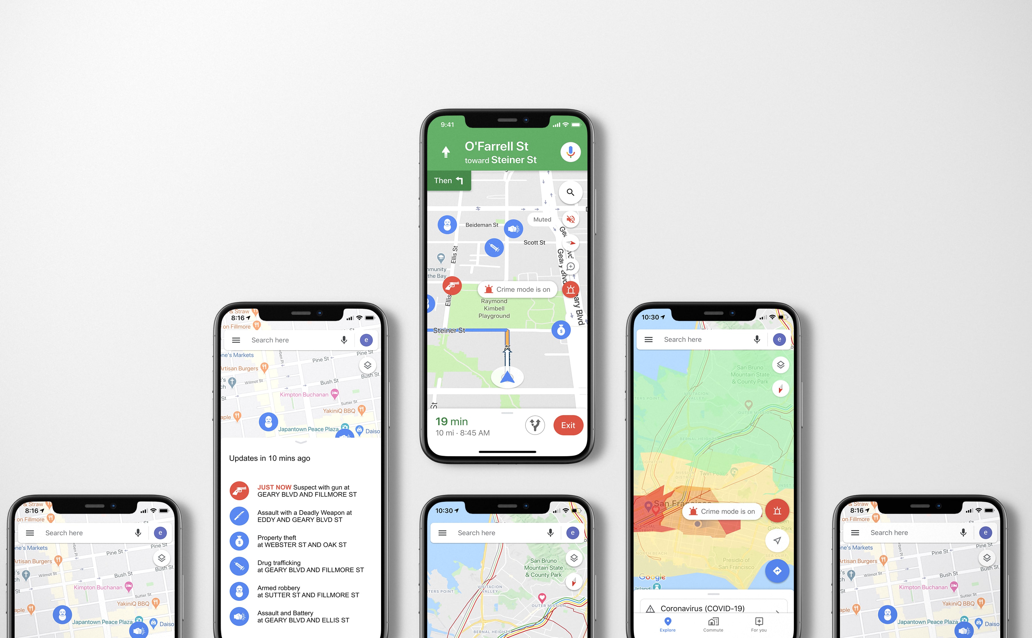 While on the navigation mode, simply touch the crime icon to activate “Google crime” to view the current security level in real-time.
